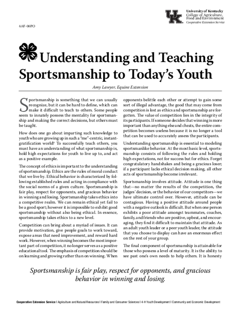 Sportsmanship is fair play, respect for opponents, and gracious behavior in winning and losing. Sportsmanship takes ethics into a competitive realm. We can remain ethical yet fail to be a good sport; however it is impossible to exhibit good sportsmanship without also being ethical.
