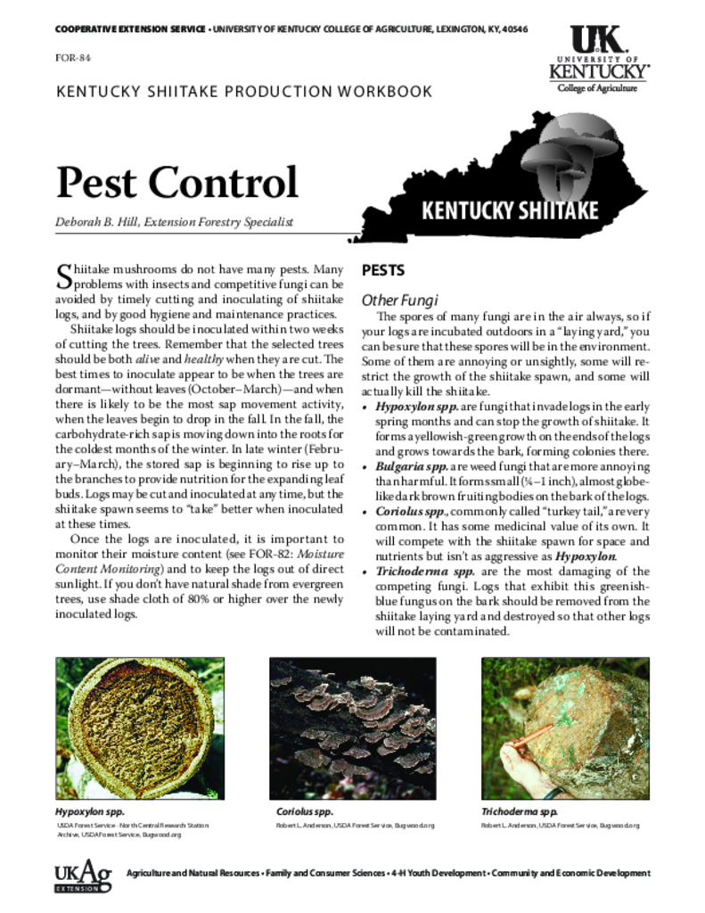 Shiitake mushrooms do not have many pests. Many problems with insects and competitive fungi can be avoided by timely cutting and inoculating of shiitake logs, and by good hygiene and maintenance practices.