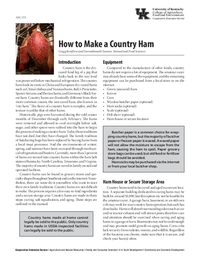 Country hams can be found in grocery stores and specialty shops throughout Southeast and on the internet. Nonetheless, there are some do-it-yourselfers who want to start their own family traditions. Country hams are not difficult to make. The process requires a few easy-to-find ingredients and a secure storage area. Country hams are made in three steps: curing, salt equalization, and aging. These steps are outlined in the manual.
