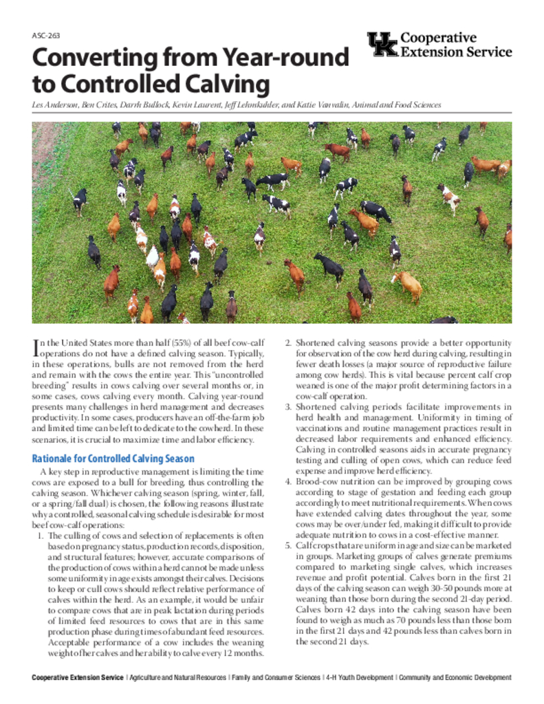 In the United States more than half (55%) of all beef cow-calf operations do not have a defined calving season. Typically, in these operations, bulls are not removed from the herd and remain with the cows the entire year. This "uncontrolled breeding" results in cows calving over several months or, in some cases, cows calving every month. Calving year-round presents many challenges in herd management and decreases productivity. In some cases, producers have an off-the-farm job and limited time can be left to dedicate to the cowherd. In these scenarios, it is crucial to maximize time and labor efficiency.