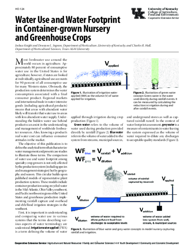 The objective of this publication is to define the analytical terms that characterize water management and present case studies to illustrate those terms. The comparison of water use and water footprint among specialty crop growers is not only affected by the production system (including species and management strategies) but by geography and season. This document builds upon published models of representative plant production systems. These models include container production using recycled water in the mid-Atlantic, Ohio Valley, southwest, and Pacific northwest regions of the U.S. and greenhouse production implementing rainfall capture and overhead and ebb/flood irrigation strategies in the southeast.