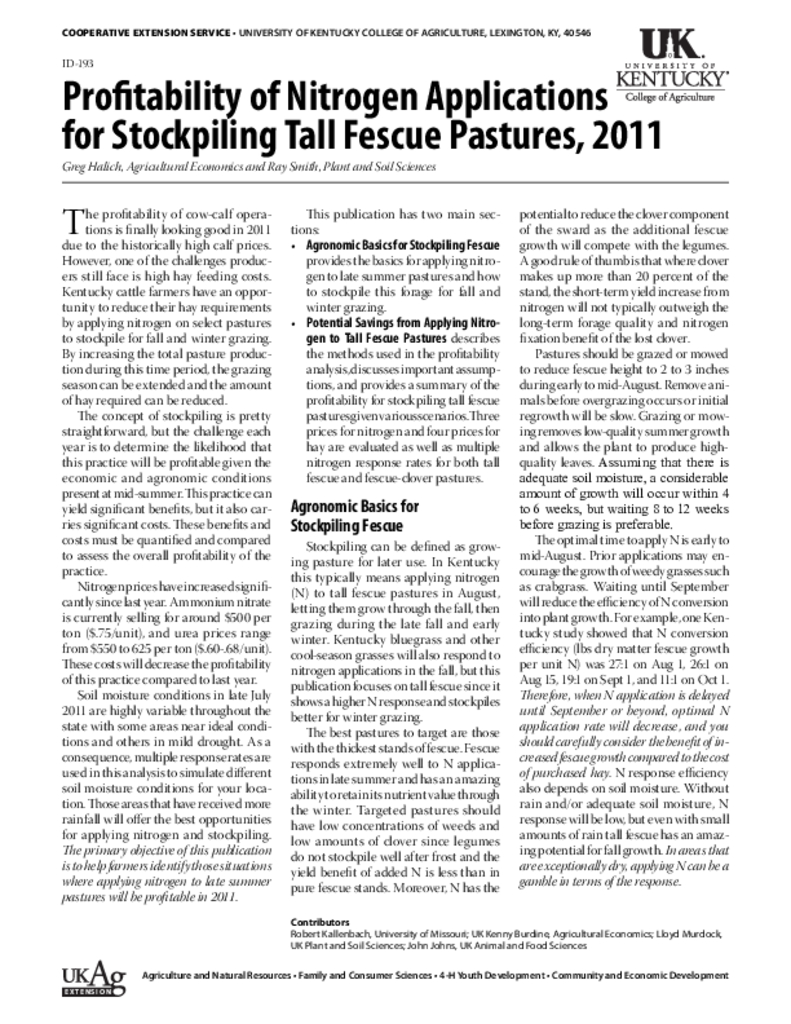 Profitability of Nitrogen Applications for Stockpiling Tall Fescue Pastures: 2011 Guide