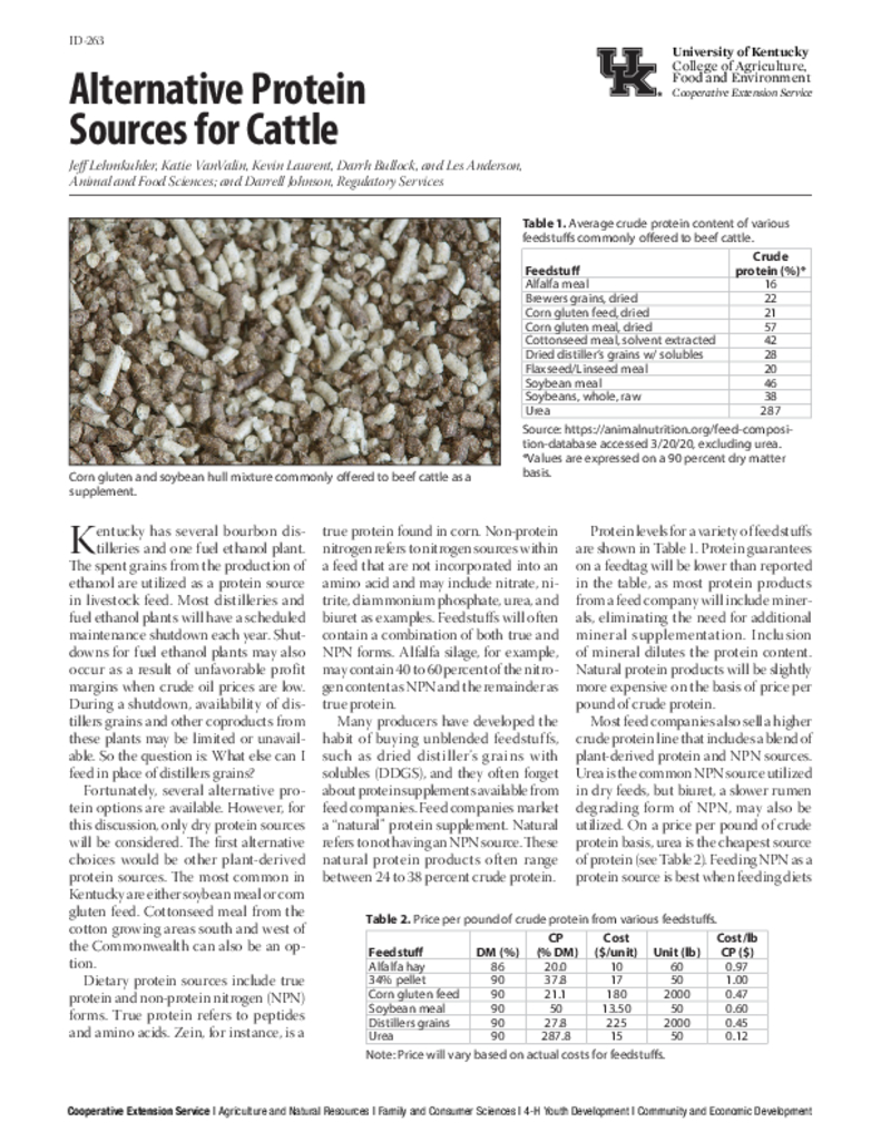 Kentucky has several bourbon distilleries and one fuel ethanol plant. The spent grains from the production of ethanol is utilized as a protein source in livestock feed. Shutdowns for fuel ethanol plants may also occur as a result of unfavorable profit margins when crude oil prices are low. Most distilleries and fuel ethanol plants will have a scheduled maintenance shutdown each year. During a shutdown, availability of distillers grains and other coproducts from these plants may be limited or unavailable. So, the question is what else can I feed in place of distillers grains?